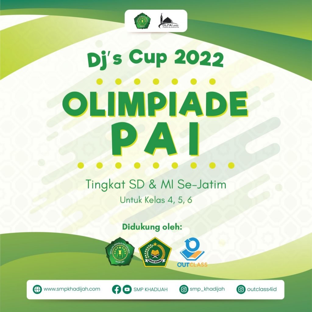 Memasuki tahun 2022 SMP Khadijah mengadakan kegiatan rutin yang bertemakan DJ’s CUP. Kegiatan DJ’s CUP tahun ini tidak lagi mengambil bidang olahraga, tetapi memilih pada bidang akademik yaitu Olimpiade Pendidikan Agama Islam (OLPAI). Ibrahim selaku ketua panitia mengatakan bahwa kegiatan DJ’s CUP tahun ini didasari atas data minat peserta didik baru yang masuk di SMP Khadijah. “Jadi kita berangkat dari data terbaru bahwa kebanyakan siswa SMP Khadijah masuk ke SMP Khadijah ini karena alasan pendidikan agama. Oleh karena itu, kami berharap dengan adanya OLPAI ini semakin menegaskan bahwa SMP Khadijah bisa menjadi mercusuar PAI di tingkat SMP kota Surabaya, syukur-syukur di Jatim”, katanya. Hj. Rif’ah Nuroniya selaku Kepala SMP Khadijah juga menyampaikan bahwa kegiatan OLPAI ini dipilih sebagai bentuk komitmen SMP Khadijah untuk menjadi sekolah yang unggul dan kompetitif, terutama dalam bidang pendidikan agama, sesuai dengan visi dan misinya.